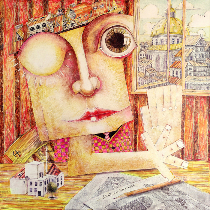 Egor Shokoladov – Architect (2021) acrylic, ink on canvas – 36″ x 36″ INQUIRE