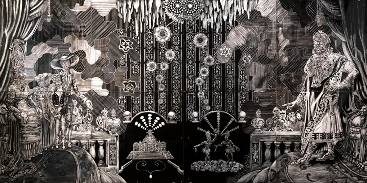 At heart, Duval Carrié is an educator, he challenges the viewer to make meaning of dense iconography derived from Caribbean history, politics, and religion. His mixed media works and installations present migrations and transformations, often human and spiritual. Recently the conceptual layering of Duval Carrié’s works has been further emphasized in his materials and through consistent attention to translucent and reflective mediums, such as glitter, glass, and resin. The introspective effects of these mediums transform his works into spatial interventions that implicate the viewer in their historicity. At their most fundamental, Duval Carrié’s works ask the viewer to complicate the Western Canon, to consider how Africa has shaped the Americas, and how the Caribbean has shaped the modern world.