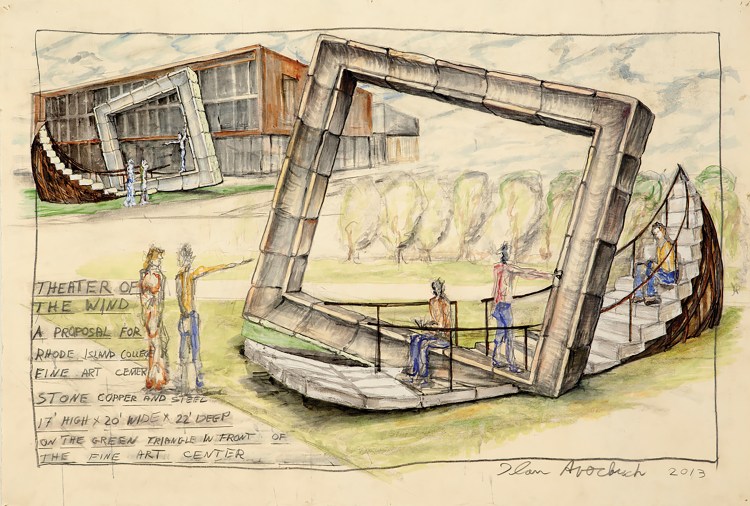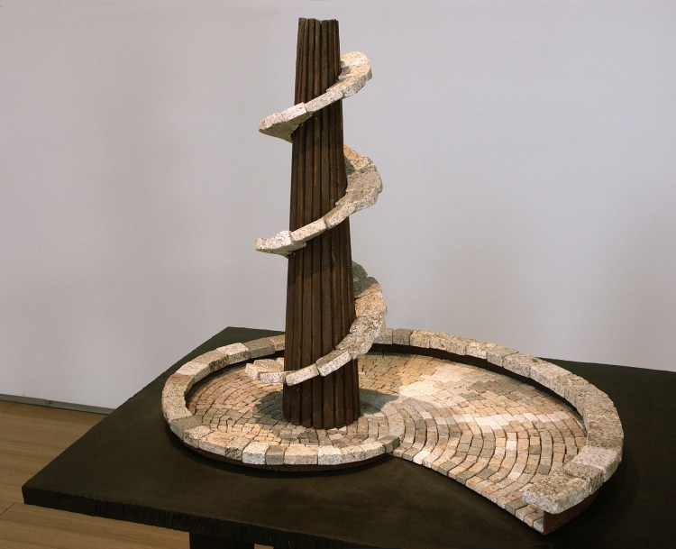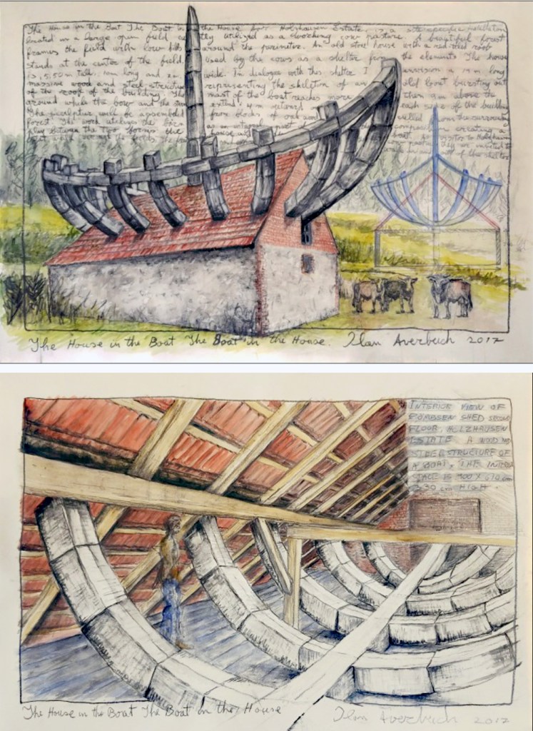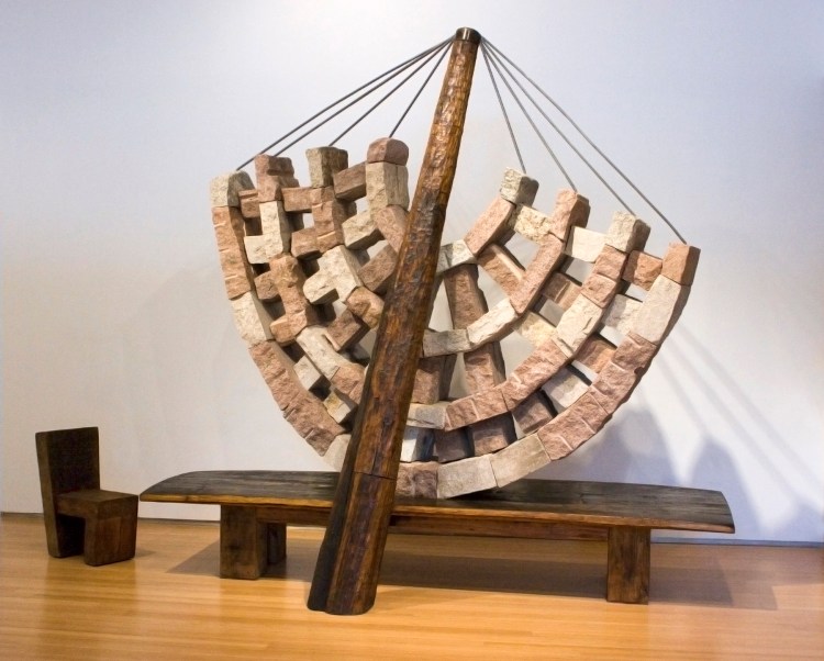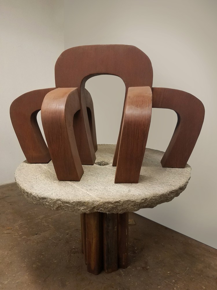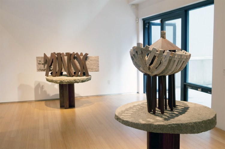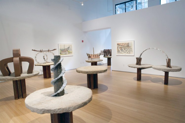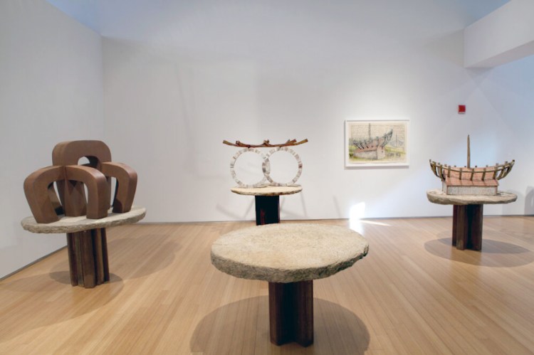 The Lily Pond series revolves around a collection of sculptures, curious, craftsman-like feats atop circular granite slabs that appear to float, like massive lily pads, (and in reality are supported by clusters of metal legs). Made out of stone and weathered, rust-colored steel, the pieces have an ancient, tawny feel. The objects and structures themselves—simple tools and clever architectures—remain nonspecifically old and of mysterious, or mythological, origin—Etruscan or Atlantean? As with archaeology, Averbuch’s findings seek to connect us with a past; two works, a barrel-shaped sculpture and its drawn plans, refer to a cuneiform-inscribed clay cylinder from 539 BCE Mesopotamia that is the first known declaration of human rights. They also speak to potential fates: The Ark, After Paris, a hut in a boat on precarious pylons, evokes the consequences of leaving recent climate accords (and also conjures up the shallow Trojan prince who provoked war, destruction and ultimately his own demise), bringing to mind ancient floods and not-so-distant futures.