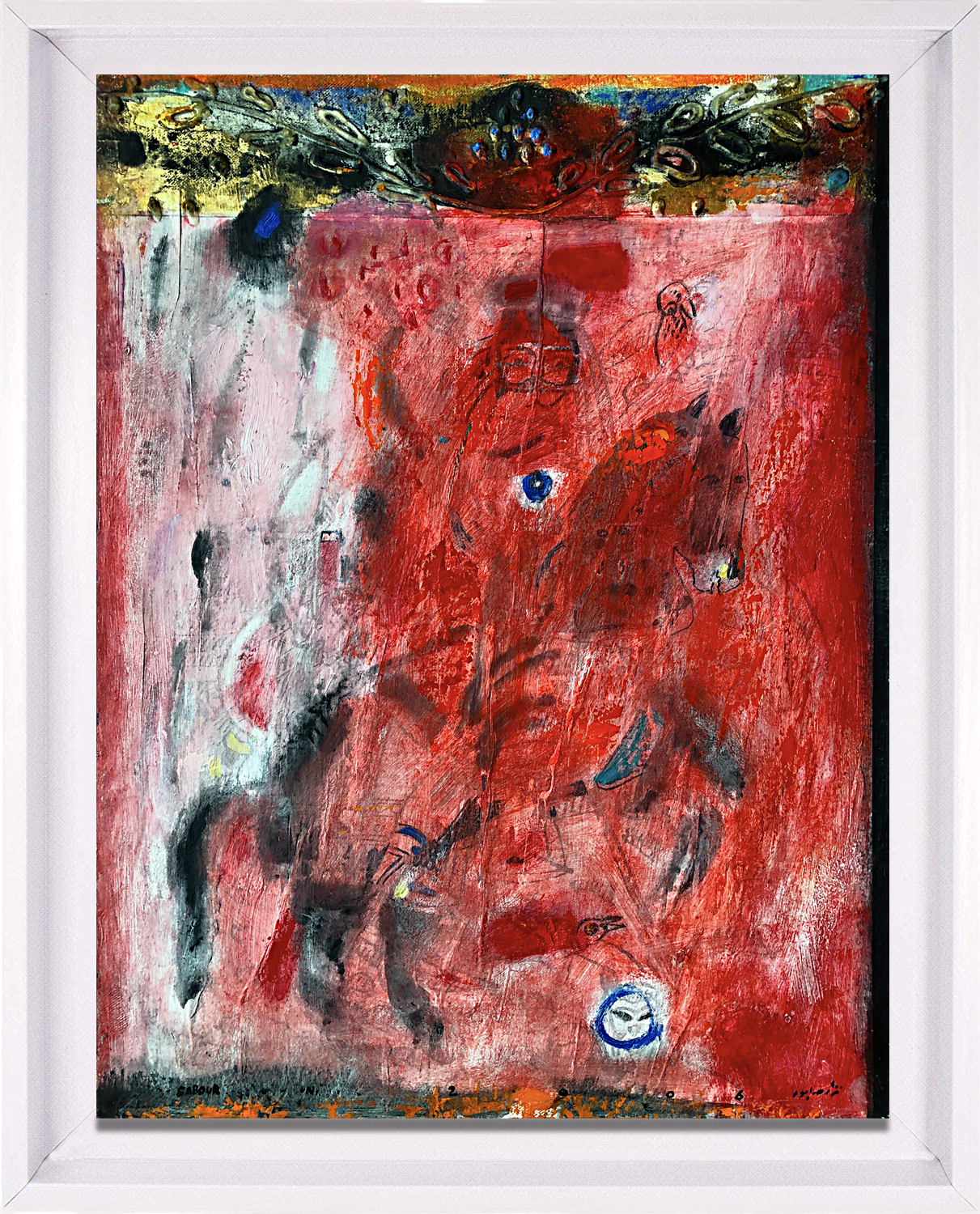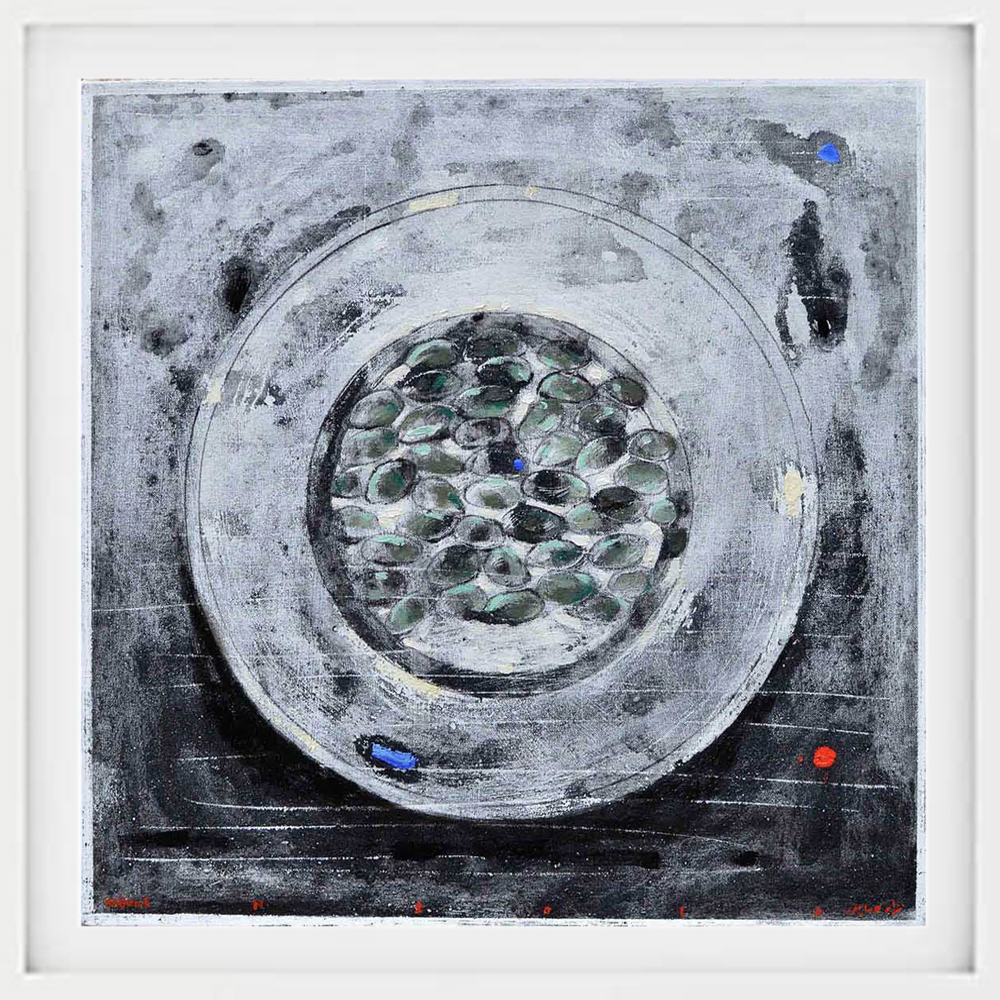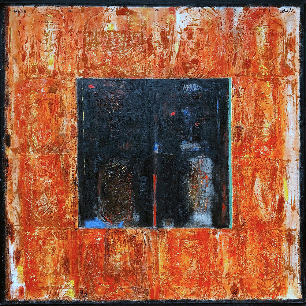 Nizar Sabour was born in Latakia and now lives and works in Damascus and Moscow. He received his PhD in art philosophy from Strugunov Academy in Moscow, the influence of Syrian-Russian cultures are reflected in his work which splits between two themes, the first has religious undertones, focusing on the artist’s fascination with historical imagery and icons whether Christian, Islamic or non-Abrahamic traditions and the second theme is very poetic. His images tend to appear archaic, utilizing traditional elements silkscreened with paint, sand, and ash on canvas, with a flattened perspective and spots of colored shapes. He employs motifs reminiscent of the European Dada movement rather than the precision of historical iconography. His recent work includes Icons, Maaloula and Palmyra have a correlation to the historical and religious places in Syria where the extremists entered towns and ransacked the culture.